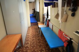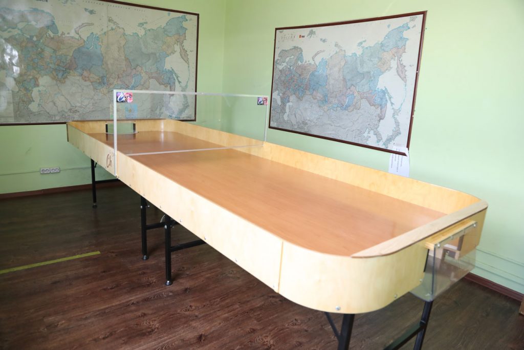 Размером 34,6 кв.м со специальным инвентарем и оборудованием для инвалидов по зрению (теннисный стол для игр в «Шоудаун»).