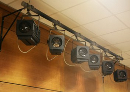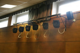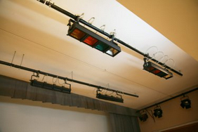 Оборудование сцены: 16 софитов на двух опускающихся штанкетах, 14 софитов на боковых порталах.