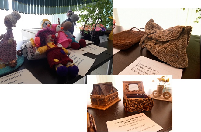 Ярмарка началась с выставки декоративно-прикладного искусства. Участники демонстрировали свои изделия: вязанные игрушки,традиционные куклы в народных одеждах, бисероплетение статуэтки и украшения, резные шкатулки и многое другое.
