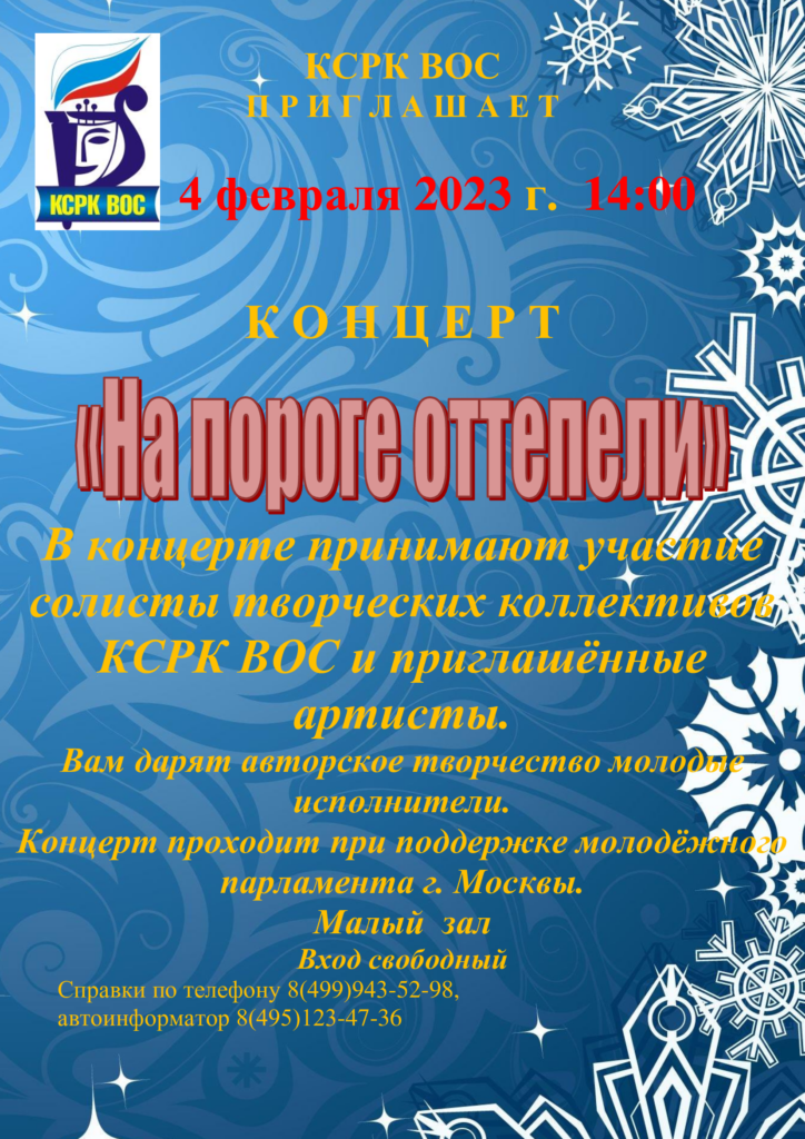 4 февраля в малом зале Культурно-спортивного реабилитационного комплекса ВОС состоится концерт «На пороге оттепели». Ждем всех гостей в субботу в 14:00.