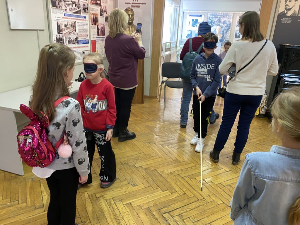 Несмотря на свой юный возраст, посетители музея активно интересовались экспозицией музея. Ребята узнали о существовании Всероссийского общества слепых, которое объединяет людей с проблемами зрения. Смогли подержать в руках продукцию предприятий, изготовленную руками незрячих людей, увидели звуковые мячи, велотандем, биатлонную установку для слепых. Познакомились с творческими работами незрячих скульпторов, художников, резчиков по дереву и т.п. В рамках интерактивного занятия ребята узнали правилах общения с незрячими, просмотрели фрагмент фильма с тифлокомментарием, попробовали узнать по запаху специи и наощупь определить изображения на тактильных тифлопособиях. Также был проведен мастер-класс по письму шрифтом Брайля и ходьбы с белой тростью.
