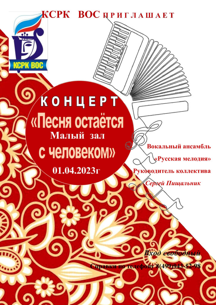 1 апреля в 15:00 приглашаем всех любителей русских народных и эстрадных песен, популярных романсов на замечательный концерт «Песня остаётся с человеком» в исполнении Вокального ансамбля «Русская мелодия».