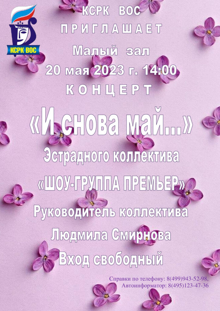 20 мая в Малом зале КСРК ВОС состоится концерт «И снова май…» эстрадного коллектива «Шоу-группа премьер». Руководитель коллектива Людмила Смирнова.