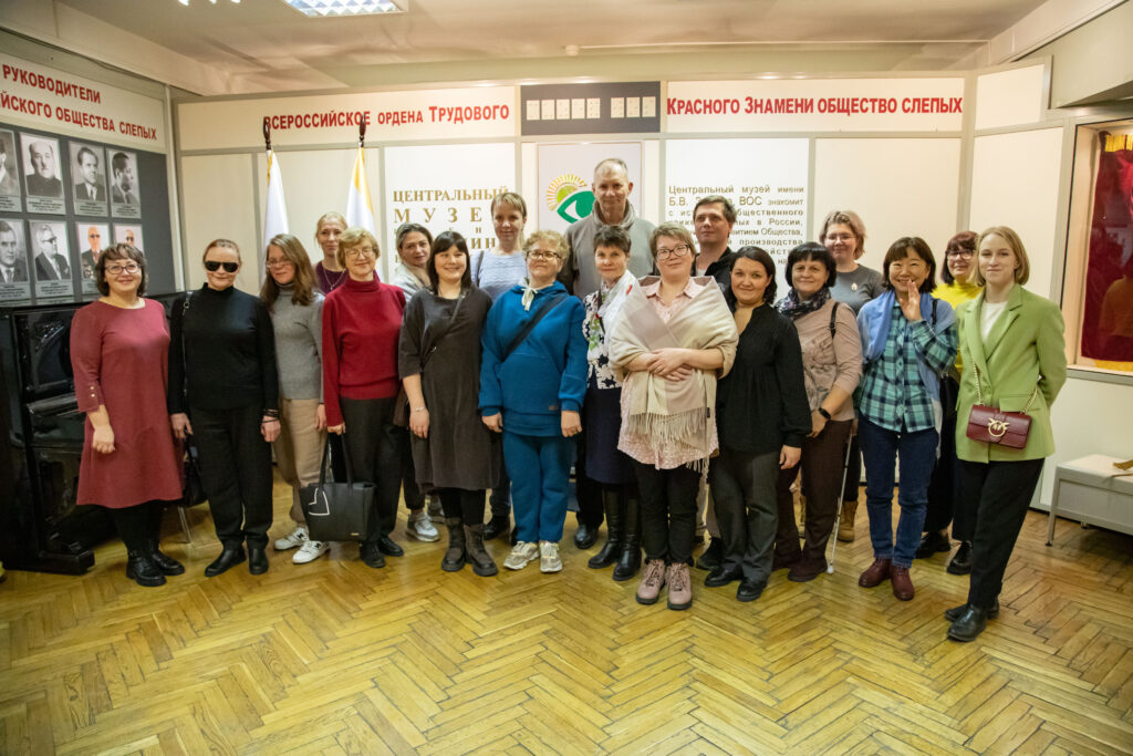 25 октября 2023 года в Центральном музее им. Б. В. Зимина ВОС состоялась обзорная экскурсия с тематическим уклоном на историю ВОС для группы обучающихся в Институте профессиональной реабилитации и подготовки персонала ВОС «Реакомп». Посещение музея состоялось в рамках обучения по программе «Социальная реабилитация» (Реабилитация инвалидов по зрению в местных организациях ВОС – подготовка председателей и секретарей). Посетители узнали о том, как создавалась и развивалось Общество, о значимых событиях и выдающихся деятелях ВОС. Познакомились с достижениями восовцев в науке, спорте и культуре. Дополнительно для гостей было организовано выступление преподавателя учебных курсов КСРК ВОС Боткиной С.А. с рассказом о знаниях и навыках, которые получают инвалиды по зрению в учебных классах КСРК.