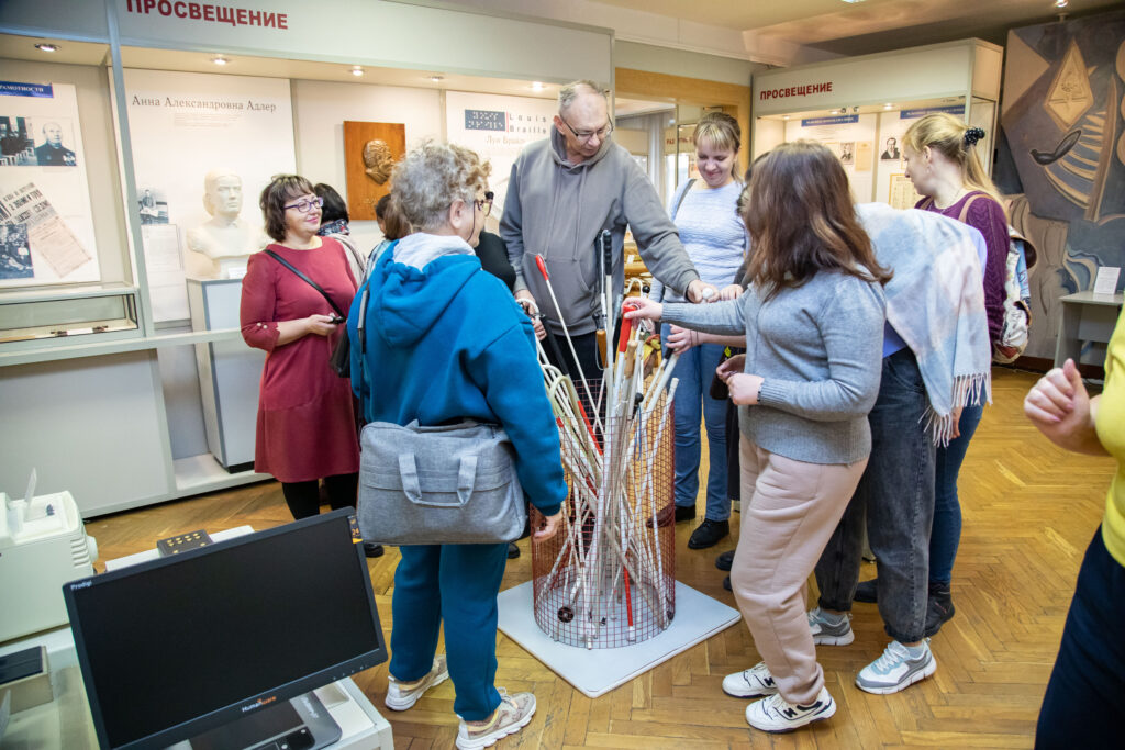 25 октября 2023 года в Центральном музее им. Б. В. Зимина ВОС состоялась обзорная экскурсия с тематическим уклоном на историю ВОС для группы обучающихся в Институте профессиональной реабилитации и подготовки персонала ВОС «Реакомп». Посещение музея состоялось в рамках обучения по программе «Социальная реабилитация» (Реабилитация инвалидов по зрению в местных организациях ВОС – подготовка председателей и секретарей). Посетители узнали о том, как создавалась и развивалось Общество, о значимых событиях и выдающихся деятелях ВОС. Познакомились с достижениями восовцев в науке, спорте и культуре. Дополнительно для гостей было организовано выступление преподавателя учебных курсов КСРК ВОС Боткиной С.А. с рассказом о знаниях и навыках, которые получают инвалиды по зрению в учебных классах КСРК.