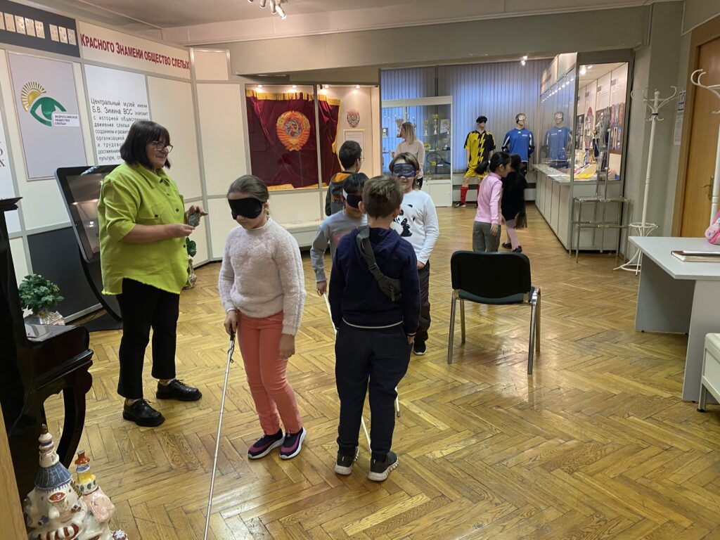 30 октября 2023 года в Центральном музее им. Б.В. Зимина ВОС состоялась обзорная экскурсия по музею и интерактивное занятие «Тифлоприборы и тифлопособия: «Трогать нужно!» для обучающихся 2 класса «Б» и 2 класса «Г» ГБОУ школы №141 им. Героя Советского Союза Рихарда Зорге. Несмотря на свой юный возраст посетители музея проявили большой интерес к экспонатам музея. Экскурсовод познакомил ребят деятельностью Всероссийского общества слепых, которое объединяет людей с проблемами зрения. Юные посетители смогли подержать в руках продукцию предприятий, изготовленную руками незрячих людей, увидели звуковые мячи, велотандем, биатлонную установку для слепых. Самостоятельно попробовали воспользоваться такими тифлоприборами, как весы, определитель цвета и света, определитель уровня жидкости и т.п., узнали, с помощью каких специальных приспособлений учатся их незрячие сверстники. Познакомились с творческими работами инвалидов по зрению. В рамках интерактивного занятия ребята узнали правила общения с незрячими, просмотрели фрагмент фильма с тифлокомментарием, попробовали определить по запаху специи и на ощупь – изображения на тактильных тифлопособиях. Также был проведён мастер-класс по письму шрифтом Брайля и ходьбе с белой тростью.
