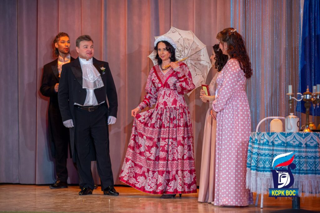 3 февраля в КСРК ВОС царило необычное оживление: в коридорах можно было увидеть дам в бальных платьях и сверкающих диадемах, кавалеров во фраках и цилиндрах, крестьян в живописных русских одеждах. А в фойе малого зала КСРК ВОС публика спешила приобрести последние билеты на премьеру оперного спектакля «Евгений Онегин», которую давал московский музыкально-поэтический театр КСРК ВОС «Опера – Белиссима». Зал был полон. Гости по нарядности одежд могли бы посоперничать с героями на сцене. Только с поправкой в моде на два века. С приветствием ко всем обратился заслуженный работник культуры РФ, художественный руководитель КСРК ВОС Хаялетдинов Анатолий Николаевич. Забегая вперёд, скажу, что в финале президент ВОС – Владимир Васильевич Сипкин поблагодарил коллектив театра за работу и доставленное удовольствие.