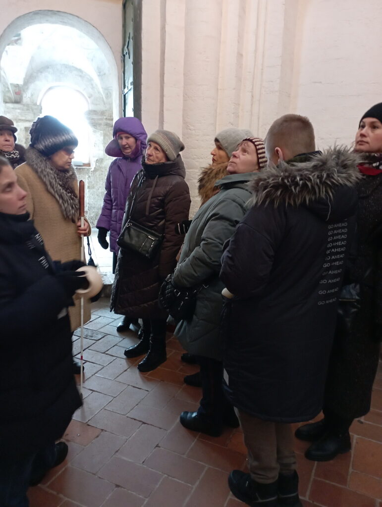 В этот раз нас было уже больше – 11 человек. Особенно приятно, что в одной группе по Собору путешествовали люди совершенно разных возрастов. Самый юный участник – Артём Колосков учится в седьмом классе школы-интерната №1 для слепых детей. Зрительные возможности в группе тоже варьировались от полной потери зрения до полного отсутствия его нарушения. Откровенно скажем, что сейчас в храме холодно. Ведь в нём никогда не было никакого отопления. Потом на первом этаже провели некоторые отопительные коммуникации. Но как только поднимешься по крутой винтовой лестнице, проходящей в толще стены, сразу ощущаешь прямо-таки ледяное дыхание. Однако, несмотря на это, никто из группы не сошёл с маршрута раньше завершения экскурсии. Здесь надо вспомнить, что весна уже начинается. Так что даже трёхметровые стены Собора будут постепенно прогреваться. Простая логика говорит о том, что следующим экскурсантам будет теплее.