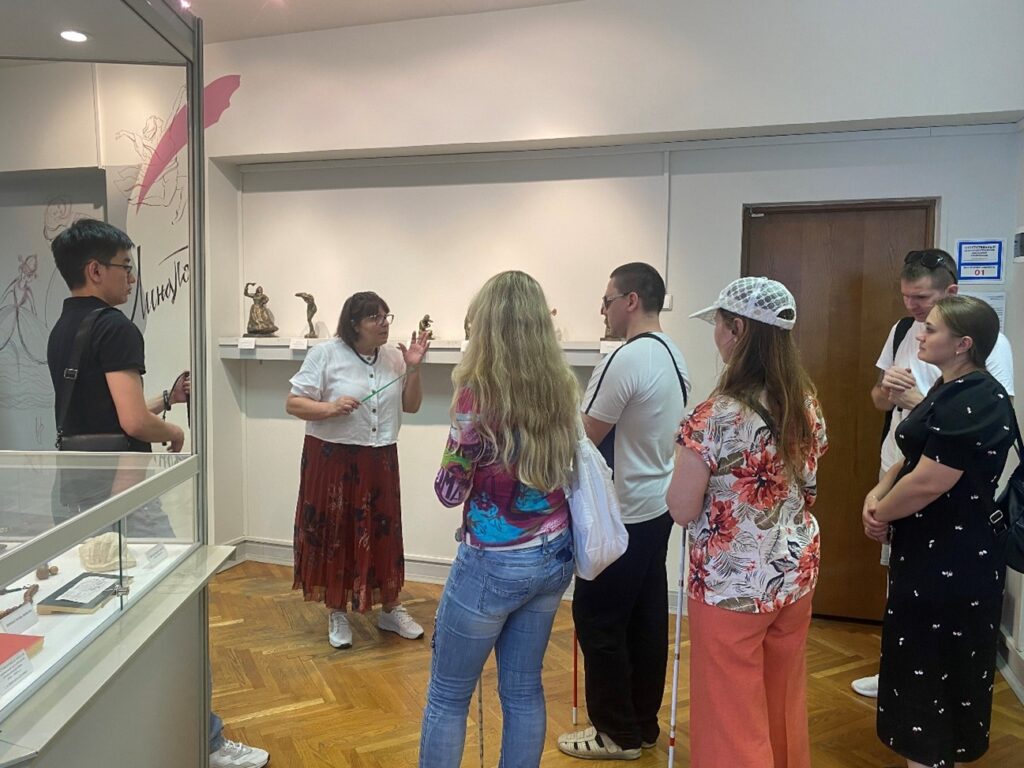 Экскурсия для слушателей курсов состоялась 23 мая 2024 г. (первое занятие). Сотрудниками музея было рассказано об истории создания Общества, о деятельности ВОС в годы Великой Отечественной войны и в послевоенный период, о деятельности ВОС в настоящее время. Посетителей познакомили с выдающимися деятелями ВОС, науки, культуры и спорта. Во втором зале музея посетителям продемонстрировали тифлоприборы конца 19, начала 20 вв., а также современные технические средства реабилитации. В третьем зале посетители тактильно познакомились с творческими работами, выполненными руками инвалидов по зрению. В завершении экскурсии посетители познакомились с творчеством незрячего скульптора Лины По. Дополнительно для слушателей курсов музеем был организован показ документального фильма с тифлокомментарием «Они слышали смерть», о незрячих участниках войны – «слухачах», которые защищали от врага блокадный Ленинград.
