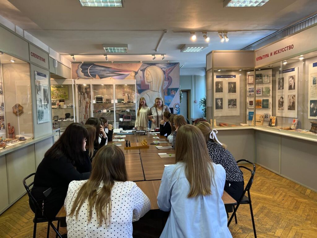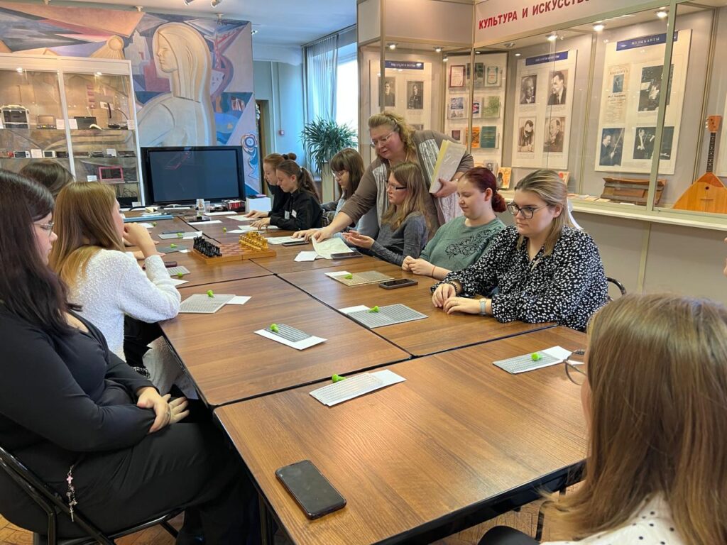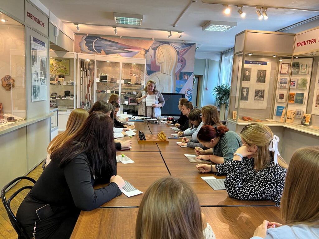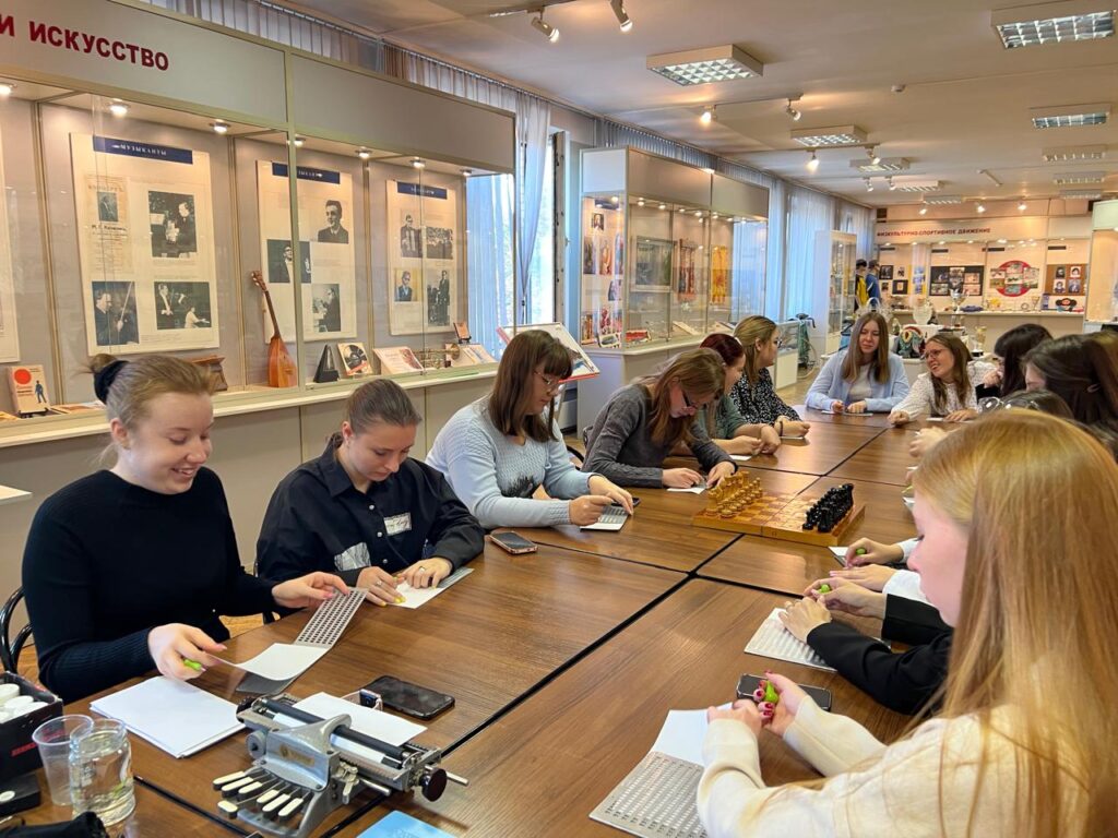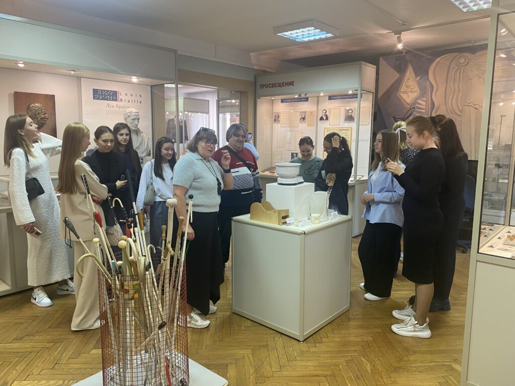3 октября 2024 года в Центральном музее им. Б.В. Зимина ВОС состоялась обзорная экскурсия по музею и интерактивное занятие «Тифлоприборы и тифлопособия: «Трогать нужно!» для студентов 2 курса очной формы обучения «Специальное (дефектологическое) образование, профиль «Тифлопедагогика» в рамках практики по «Психолого-педагогическому сопровождению лиц с ОВЗ» Института детства МГПУ. Посетители музея смогли познакомиться с историей создания и развития Общества, профессиональной реабилитацией инвалидов по зрению, достижениями незрячих в науке, культуре и спорте. Еще одной значимой темой экскурсии стало знакомство с техническими средствами реабилитации, как для культурно-бытового назначения, ориентирования, обучения, так и для занятий трудовой деятельностью. В рамках интерактивного занятия состоялось знакомство с общими правилами общения с незрячими, работа с тифлопособиями, проведены мастер-классы по письму шрифтом Брайля и ходьбы с белой тростью.