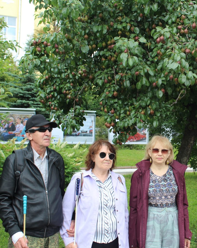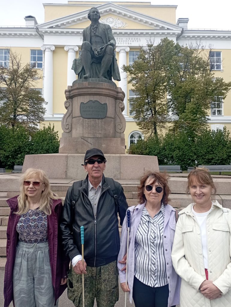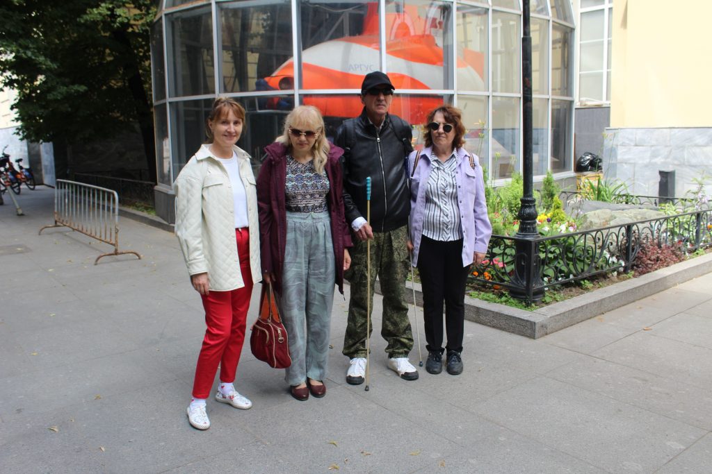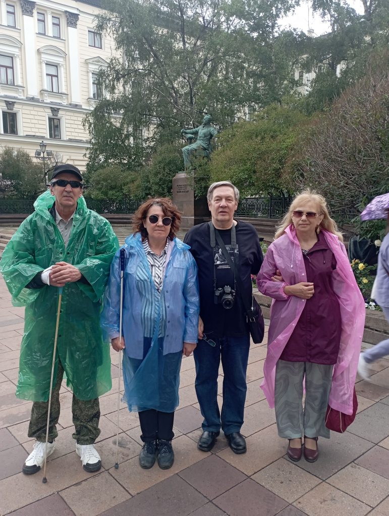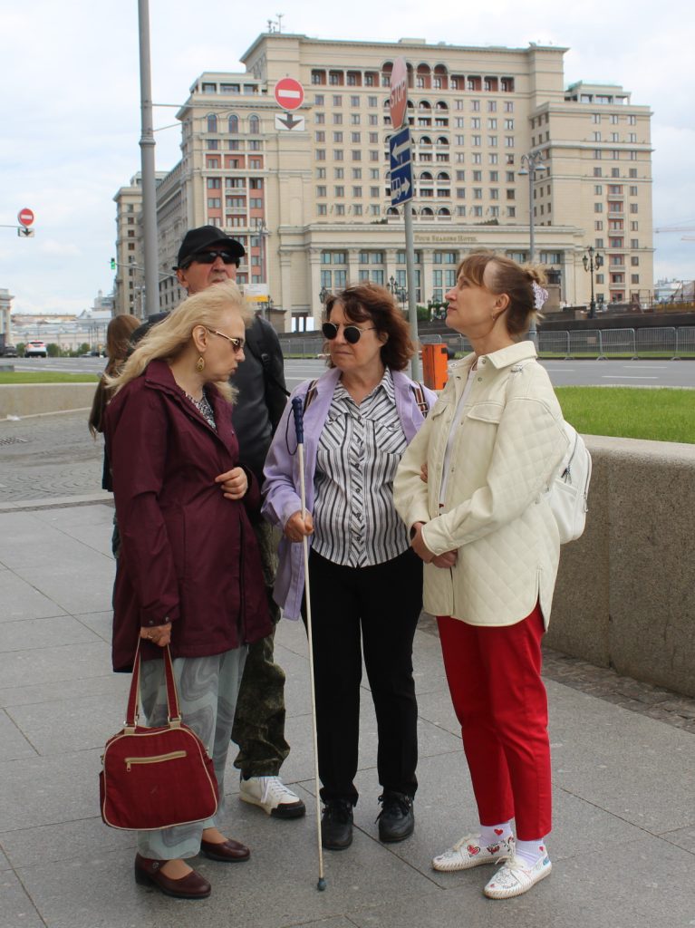 На 29 июня у нас был намечен грандиозный план путешествия по центру столицы. В качестве экскурсантов – учащиеся образовательных курсов КСРК ВОС, в качестве экскурсовода – специалист КСРК ВОС Лариса Овцынова, сопровождающие группы – сотрудник учебной части КСРК Фёдор Поляков и волонтёры. Всезнающая Алиса напророчила в этот день нескончаемый дождь и тем самым сбила с пути большую часть группы. Однако, не таковой оказалась чета Усачёвых – Андрей и Татьяна. Вместе мы совершили наше большое путешествие по Москве, четыре часа, заметьте, и не прогадали. Во-первых, всего два раза мы могли бы попасть под дождь, но в эти моменты рядом оказывалась крыша, причём в один из них это был портик посольства Азербайджана. Во-вторых, наша экскурсия превратилась в прогулку, на которой мы могли подробно обследовать всё, что хотели, зайти туда, куда с полной группой не зайдёшь. И, наконец, нам открылись те ворота, которые обычно бывают закрыты. Мы даже назвали этот день днём открытых ворот. Судите сами. Во дворе геологического музея мы прикоснулись к камню серпентиниту – зеленоватому, с разводами, похожими на извивающихся змей. Наверное, именно такой камень Иван Грозный приказывал класть в свой кубок с вином, чтобы уберечься от яда. Здесь же увидели обитаемый подводный аппарат Аргус. Маленький, всего на троих, но под водой он мог пробыть 72 часа. Ворота МГУ на Моховой также были для нас открыты. Померили шагами расстояние между скульптурой Герцена и Огарёва, стоящих с двух сторон от фасада здания. Погуляли по университетскому садику. Обнаружили не только привычные яблони и груши, но и грецкий орех, узнанный по характерному йодистому запаху ещё незрелых плодов. Ворота следующего корпуса университета тоже приняли нас. Впервые за несколько лет наши экскурсанты смогли подойти вплотную к памятнику Ломоносову. Михаил Васильевич задумчиво смотрит на Кремль, который виден за Манежной площадью. А на фронтоне здания покровительствует наукам герб СССР. Ну и, конечно, мы остановились у храма Святой Татьяны – покровительницы Московского университета. Именно в её день граф Шувалов подложил на туалетный столик императрицы Елизаветы Петровны надушенную записочку. Однако строки её говорили не о любовном свидании, а о необходимости открытия в Москве университета. Елизавета была довольна в то утро своим нарядом и указ подписала. Внутри храм Татьяны встретил нас тишиной и умиротворением. Благодаря комментарию сопровождающих, незрячие экскурсанты смогли представить образ темноволосой Святой, со спокойным и мудрым взглядом.