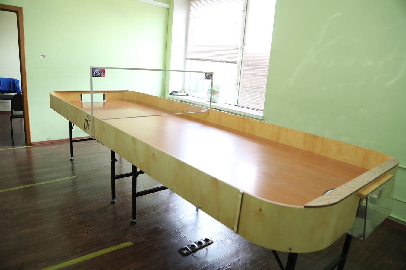 Размером 34,6 кв.м со специальным инвентарем и оборудованием для инвалидов по зрению (теннисный стол для игр в «Шоудаун»).