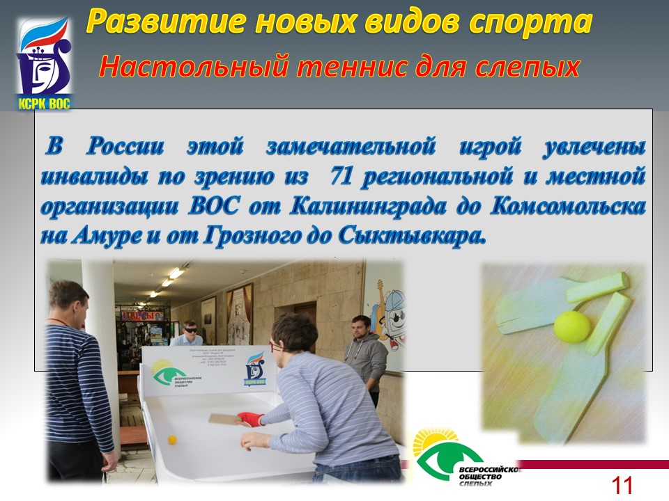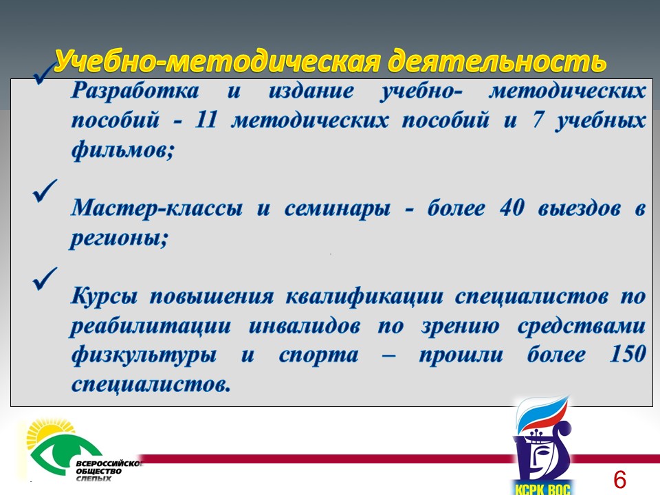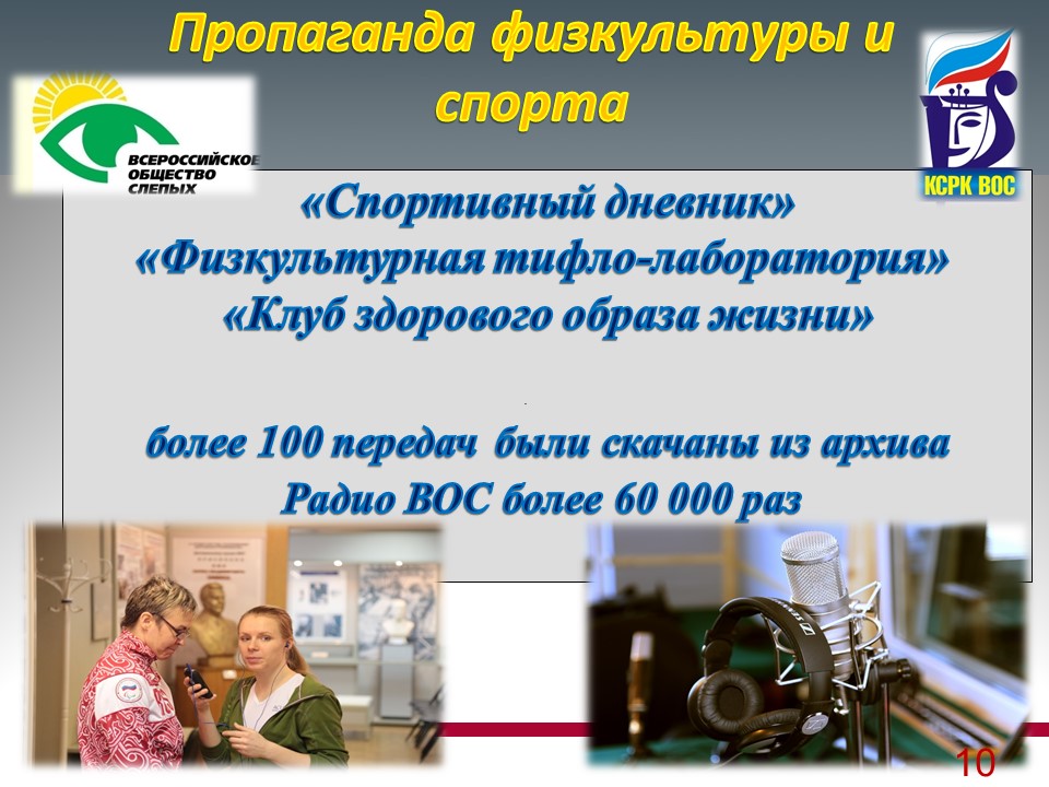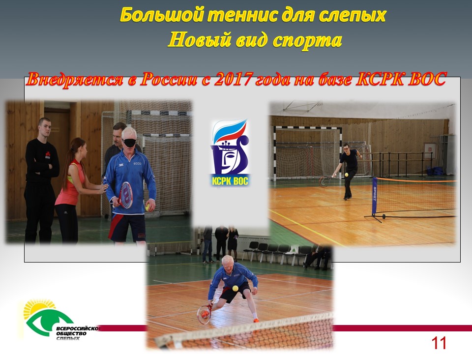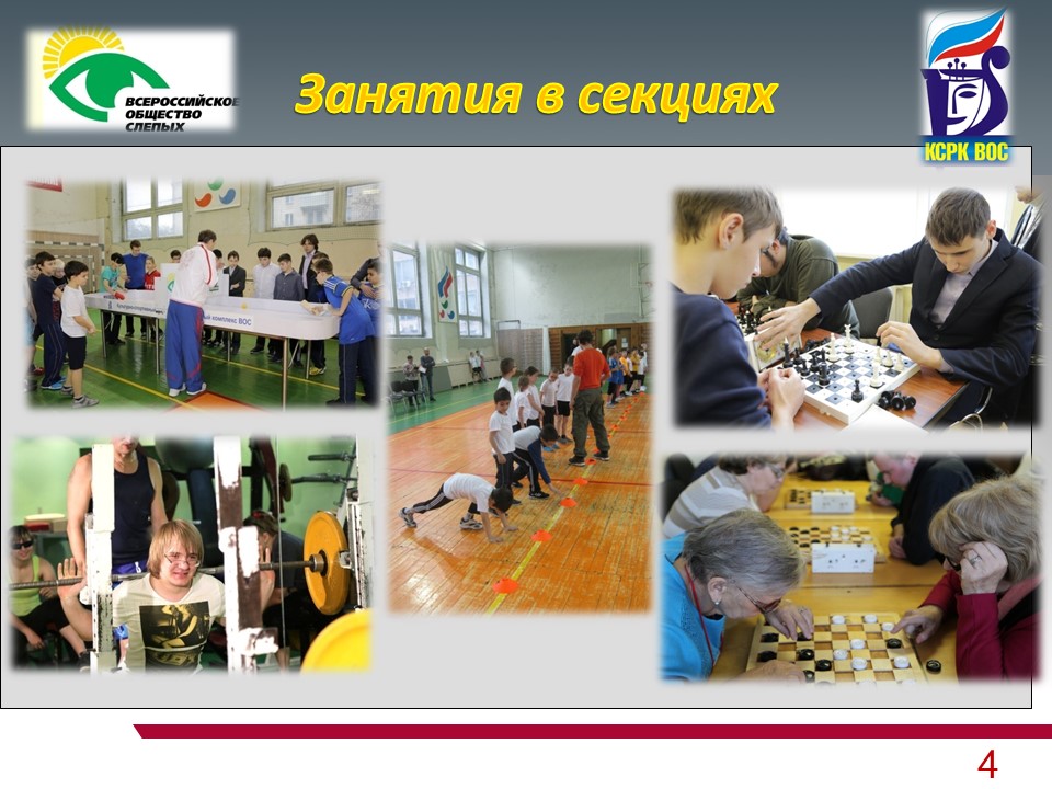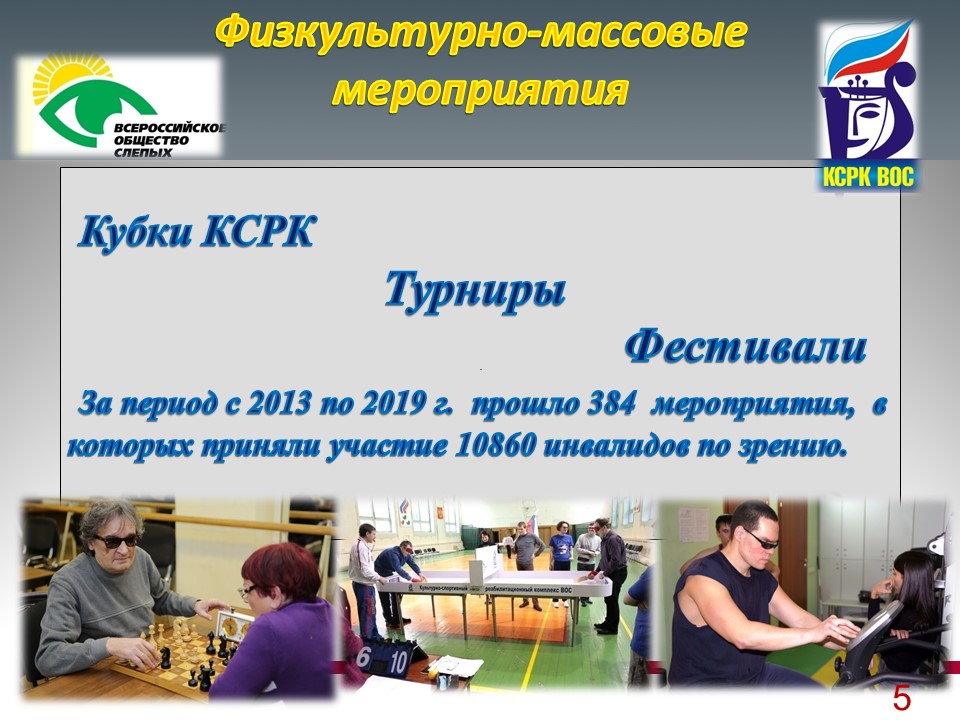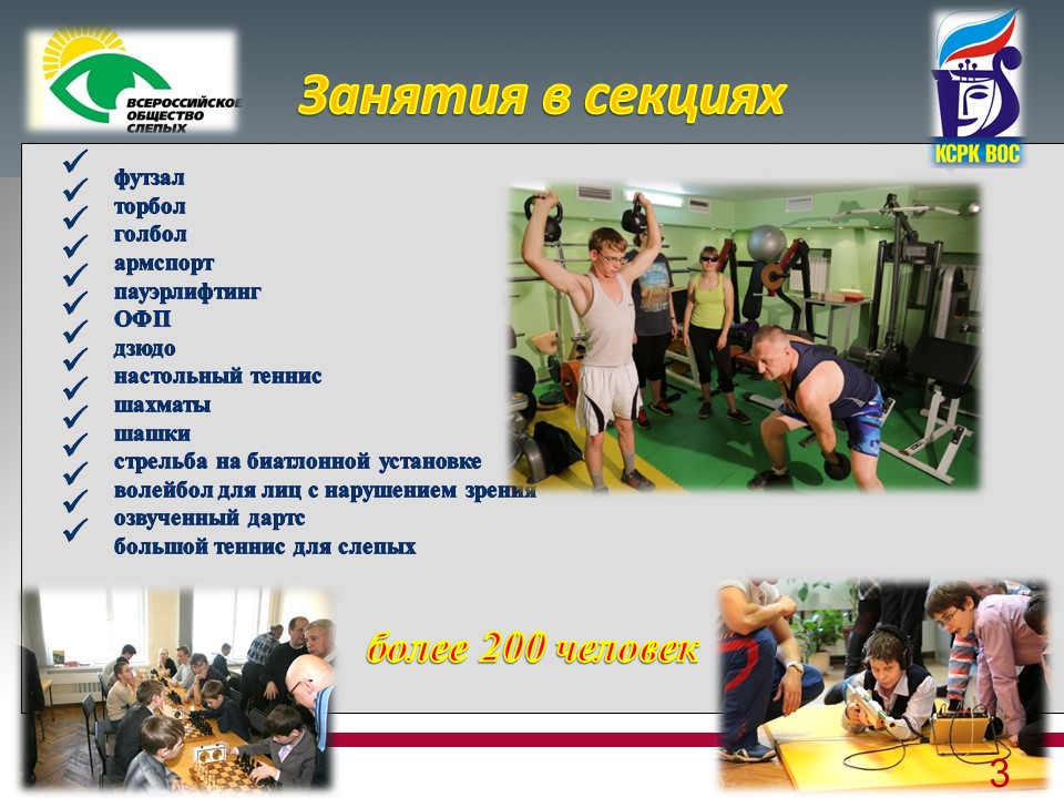 Клуб здорового образа жизни. Культурно-спортивный реабилитационный комплекс ВОС уже много десятилетий является флагманом физкультурно — спортивной работы во Всероссийском обществе слепых. В физкультурно- спортивных секциях по волейболу для лиц с нарушением зрения, большому теннису, голболу, торболу, футзалу, армспорту, пауэрлифтингу, ОФП, дзюдо, настольному теннису, шахматам, шашкам, стрельбе на биатлонных установках приобщаются к здоровому образу жизни, проходят реабилитацию и улучшают свое здоровье инвалиды по зрению всех возрастов и различного уровня подготовки. Секции регулярно посещают более 200 инвалидов по зрению. С каждым инвалидом по зрению, пришедшим в секции КСРК, специалисты и тренеры стараются работать индивидуально, применяя специальные методики и комплексы упражнений.
